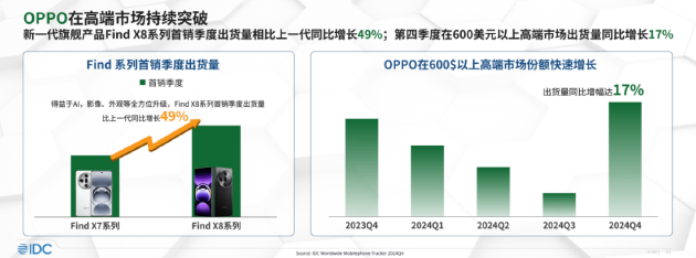 正是这份“本地身份”让 OPPO 有了在全球冲击高端的底气。回顾全球高端智能手机市场,其长期由苹果与三星双雄割据,而OPPO 正以“第三极”的身份强势突围。IDC 数据显示,2024 年 400–500 美元价位段市场整体下滑 12%,而 OPPO 却逆势登顶,成为该档位全球销量第一的品牌;在 600 美元以上的高端市场,OPPO 更实现 17% 的同比增长。Find X8 系列首销季销量同比大增 49%,为 OPPO 在全球高端市场撕开一道突破口。